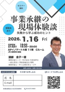 大阪支部主催のセミナー「事業承継の現場体験談 失敗から学ぶ成功のヒント」に、金子一徳理事が登壇します。